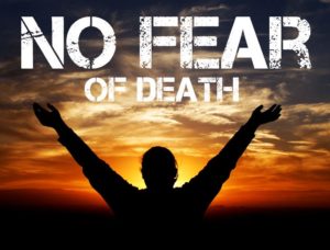 This image is the silhouette of a man holding his arms out at sunrise with the text No Fear of Death above him.